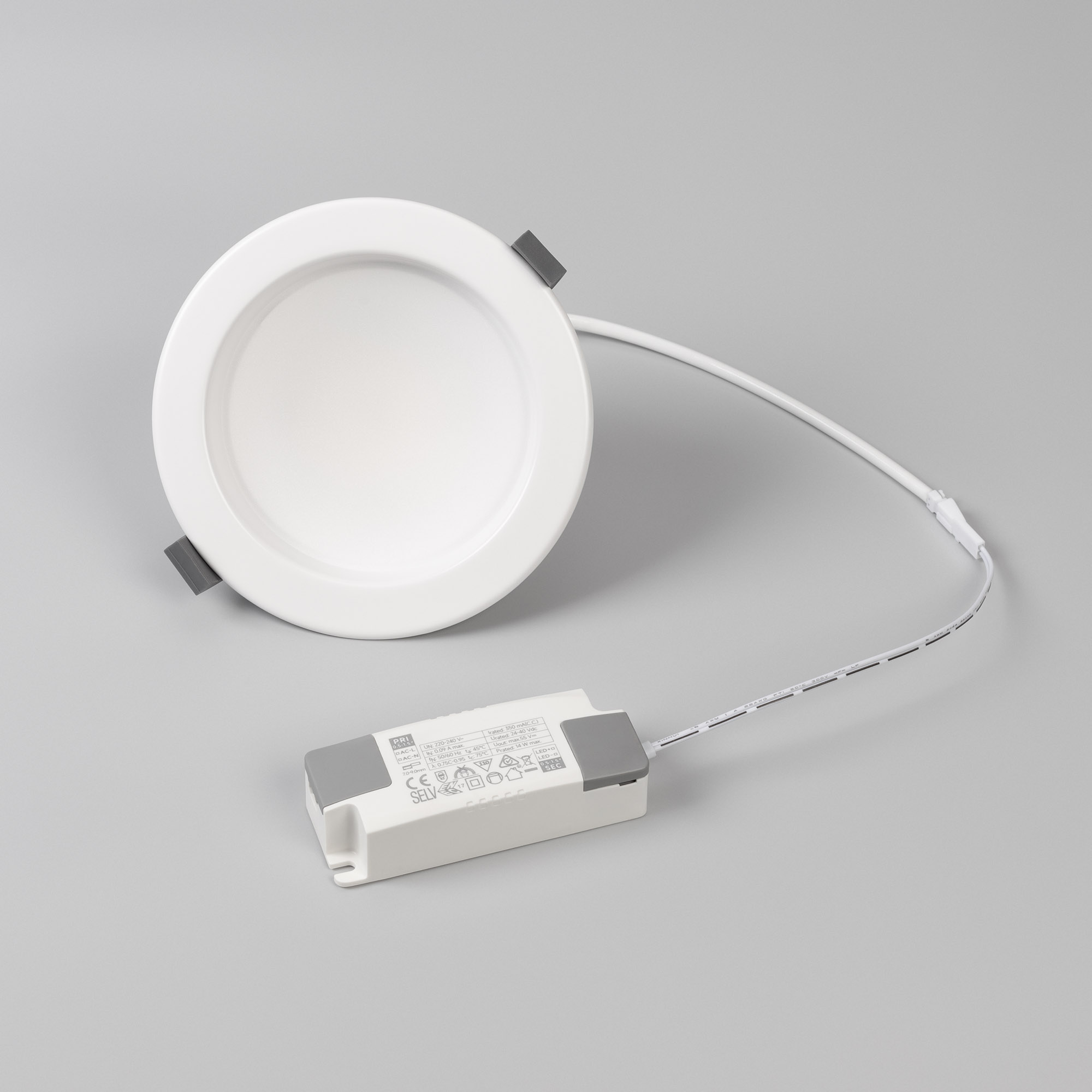 Встраиваемый круглый светильник предназначен для освещения в жилых, коммерческих и общественных помещениях. Индекс цветопередачи CRI>80 обеспечивает качественное освещение с точной передачей цветов. Алюминиевый корпус, окрашенный в белый цвет, будет гармонично смотреться в любом интерьере. Особая конфигурация корпуса позволяет эффективно отводить тепло и продлевает срок службы светодиодов. Матовый экран создает равномерное освещение без видимости точек светодиодов. Светильник с широким углом излучения 90 градусов подойдет для общего освещения помещений. Легко устанавливается в натяжные или гипсокартонные потолки с помощью пружин в монтажное отверстие. В комплекте поставляется драйвер, что позволяет безопасно и быстро подключать светильник напрямую к сети переменного тока 230 В. Корпус с защитой от пыли на уровне IP 40 применим для помещений, в которых отсутствует контакт с водой или другими жидкостями. Имеется возможность диммирования при замене штатного драйвера.