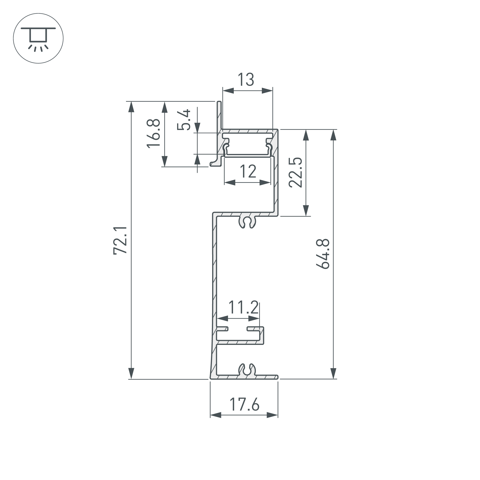 Габаритные размеры профиля составляют 2000 мм в длину, 17,6 мм в ширину и 72,1 мм в высоту. Площадка для установки светодиодных лент позволяет использовать ленту шириной до 12 мм и мощностью до 32 Вт/м. Это обеспечивает гибкость в выборе светодиодных лент и создает потрясающие световые решения.