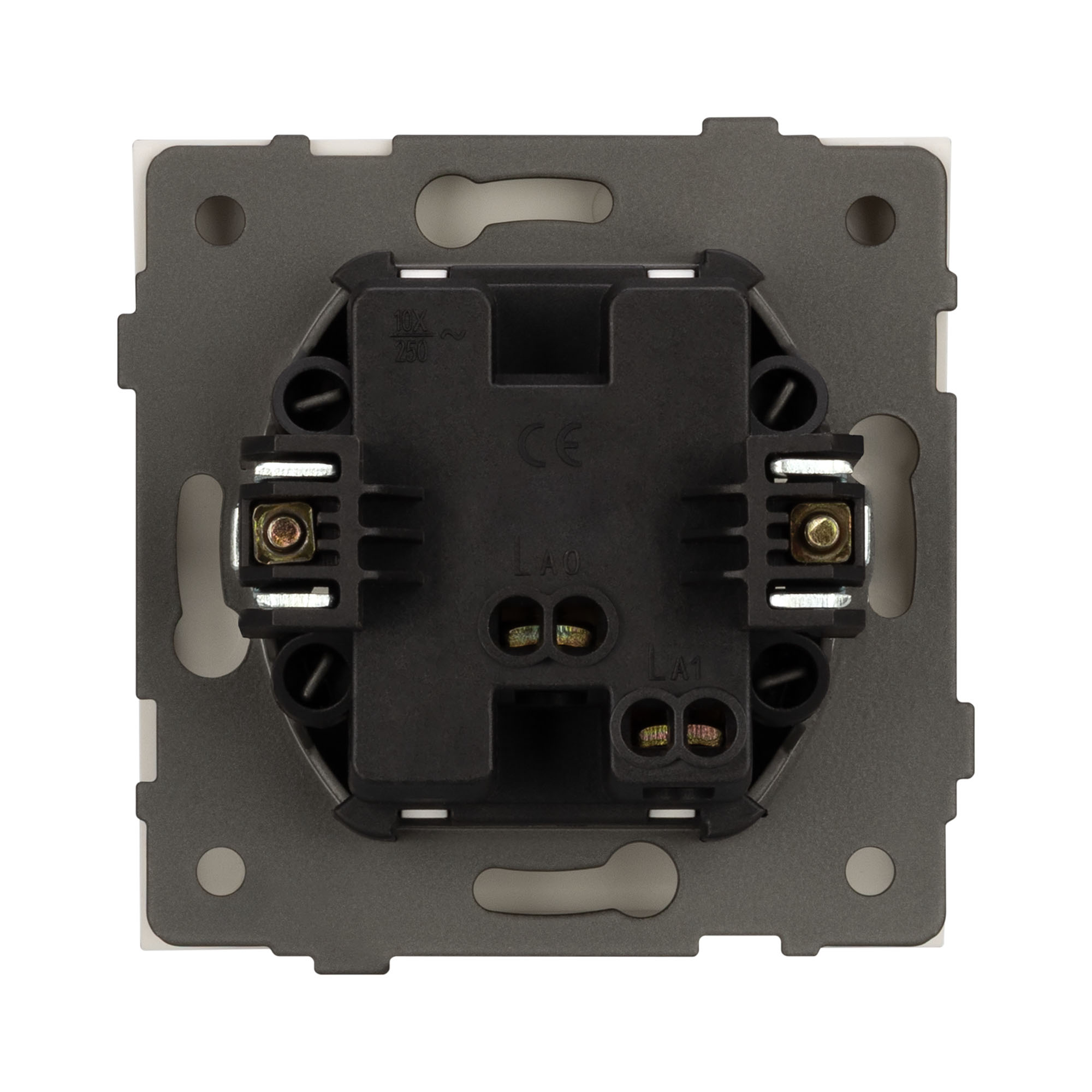 Механизм выключателя света клавишный на 1 пост 1 клавиша (непроходной). Цвет - белый, с Soft-Touch покрытием. Без фронтальной рамки. Уровень пылевлагозащиты IP20. Выключатель устанавливается в стандартный подрозетник круглого сечения диаметром 60мм.