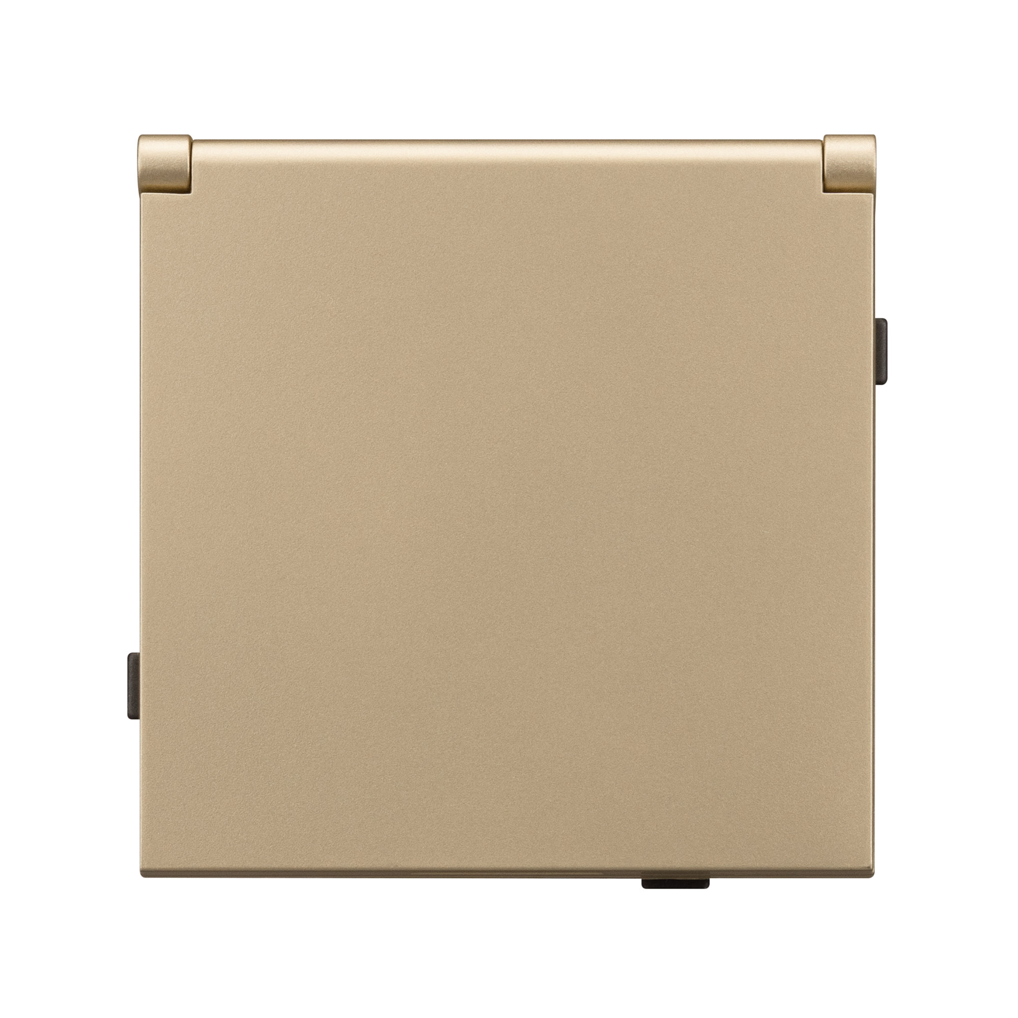 Механизм розетки с заземлением и влагозащитной крышкой совместим с рамками серии TENDO, создает утонченный минималистичный вид. Скрытый тип монтажа позволяет гармонично встроить в интерьер любого современного дизайн-проекта. Видимая часть механизма выполнена из высококачественного пластика золотого цвета и имеет покрытие Soft-Touch.