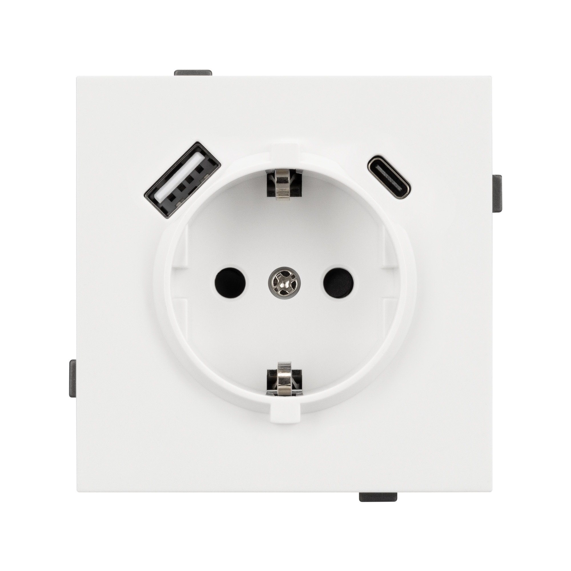 Механизм розетки с USB зарядкой, совместимый с рамками серии TENDO, создает утонченный минималистичный вид. Наличие двух USB Type A + Type C портов позволяет существенно сократить количество используемых розеточных постов под евровилку, сохраняя единую стилистику интерьера всего современного дизайн-проекта. Видимая часть механизма выполнена из высококачественного пластика белого цвета и имеет Soft-Touch покрытие, что придает изделию приятные тактильные ощущения и стильный внешний вид. Розетка оснащена заземляющими контактами и защитными шторками, обеспечивая надежное и безопасное подключение электроприборов. Контактная часть присоединяется при помощи винтовых зажимов, позволяя надежно подсоединить механизм выключателя к питающим элементам. А усиленные распорные лапки двойного захвата надежно фиксируют механизм в установочном подрозетнике круглого сечения диаметром от 60мм. Суппорт окрашен в черный матовый цвет под основу механизма и выполнен из металла толщиной 1,5мм, что обеспечивает безопасность и уверенность в установке. На каждой стороне суппорта размещены фиксирующие элементы, позволяющие комбинировать механизмы в системы до 5шт как горизонтально, так и вертикально.