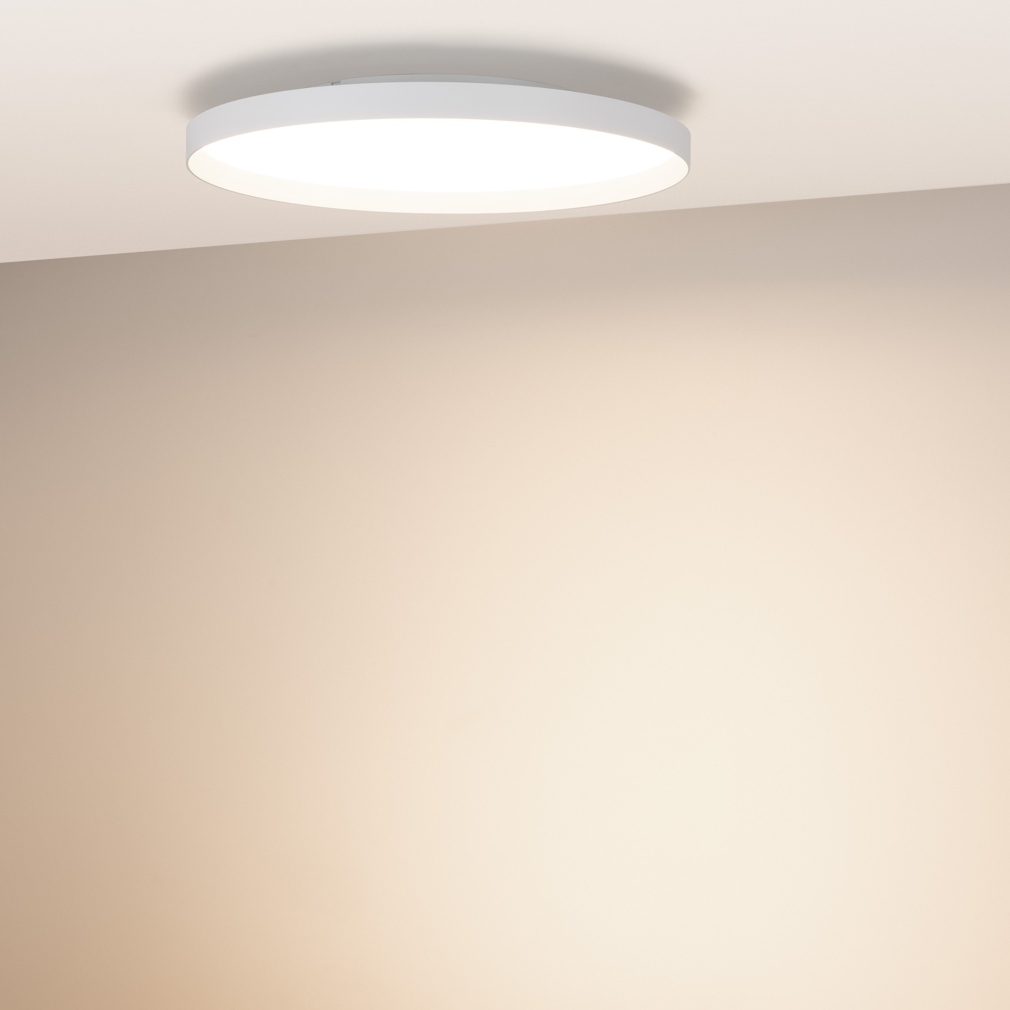 Светодиодный накладной светильник с изменяемой цветовой температурой. Мощность 50 Вт, св. поток 3340-3730 лм, 80-85 лм/Вт, теплый 2700 K, теплый 3300 K, дневной 4000K (переключается), CRI>92, угол 80°, напряжение питания 230 В. Белый круглый корпус из алюминия, матовый призматический экран PC, степень защиты IP20. Размер: Ø 600х70 мм. Размер световой части: Ø 600х39 мм, размер основания: Ø 375х34мм. Монтаж накладной. Драйвер 27-42 В, 1200 мА, пульсация <0,3%. Диммирование TRIAC.