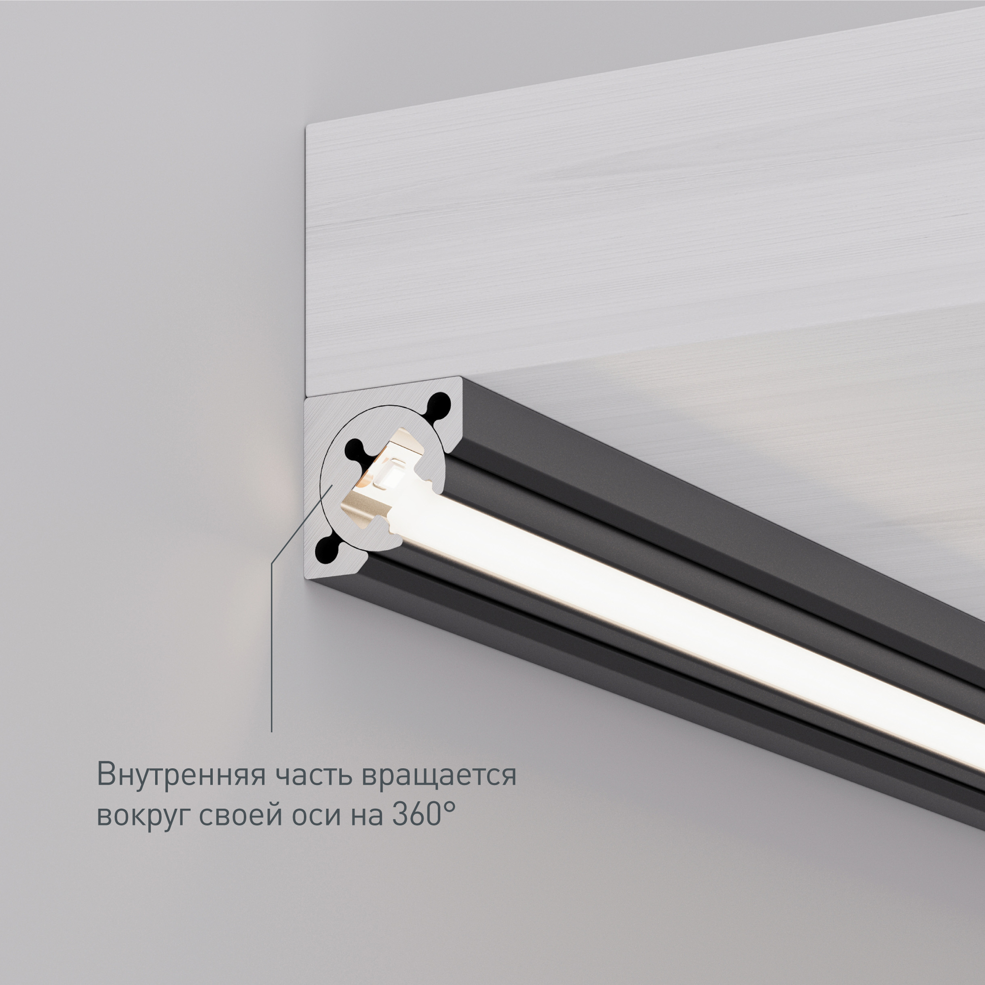 Двухкомпонентный накладной угловой профиль серо-стального цвета из алюминия в комплекте с матовым экраном из ПММА со светопропусканием 68% для подсветки мебели, пазов, ниш и других элементов интерьера. Вращающаяся внутренняя часть позволяет менять направление света, не меняя локацию светильника. Габаритные размеры профиля составляют 2000 мм в длину, 10 мм в ширину и 10 мм в высоту. Площадка для установки светодиодных лент позволяет использовать ленту шириной до 5,6 мм и мощностью до 10 Вт/м.