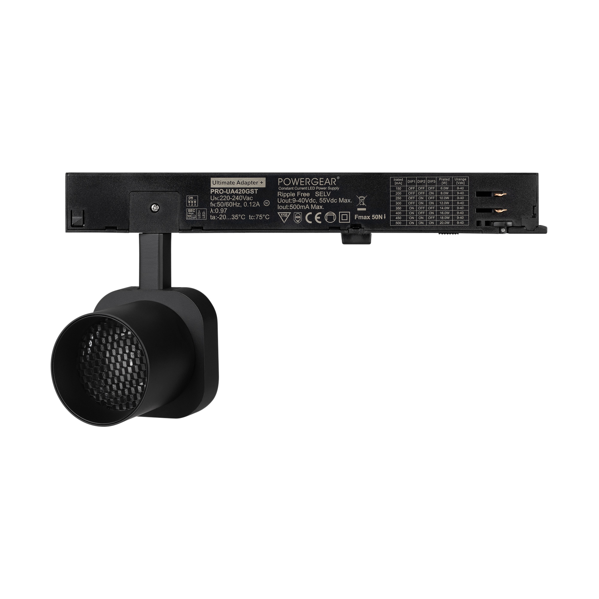 Светильник для треков/шин 4 провода. Мощность 10 Вт, св. поток 650 лм, 65 лм/Вт, теплый 3000 K, CRI>95, угол 20°, напряжение питания 230 В. Решетка HONEYCOMB в комплекте. Черный квадратный корпус из алюминия, материал линзы PC поликарбонат, степень защиты IP20. Размер световой части 60х60х62 мм. Монтаж на трек 3-фазный. Драйвер встроенный 9-40 В, 250мА., пульсация <1%