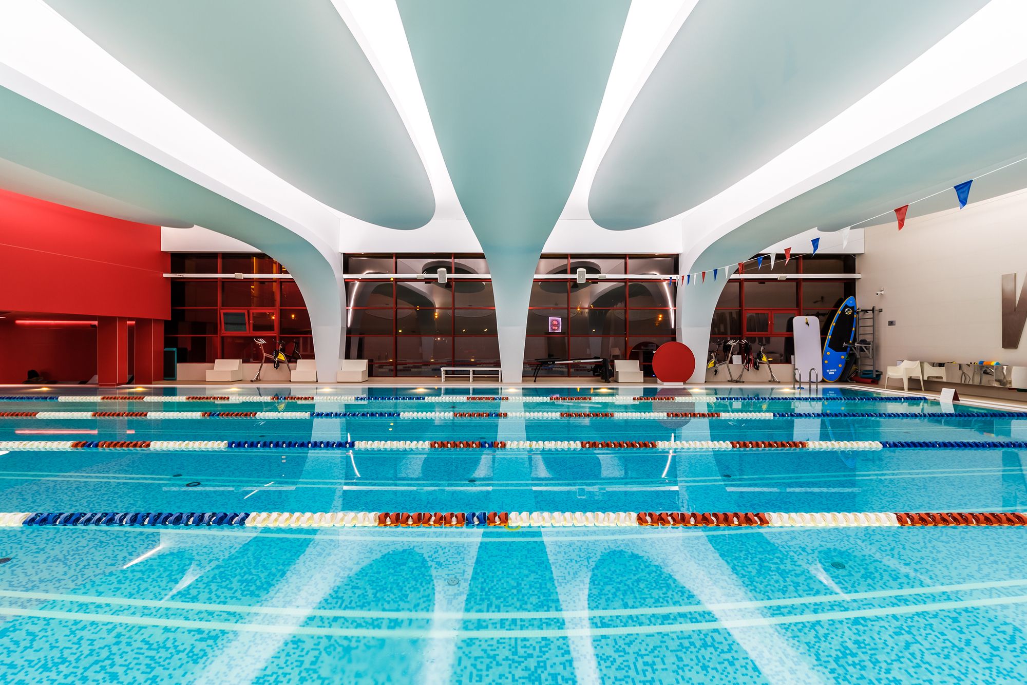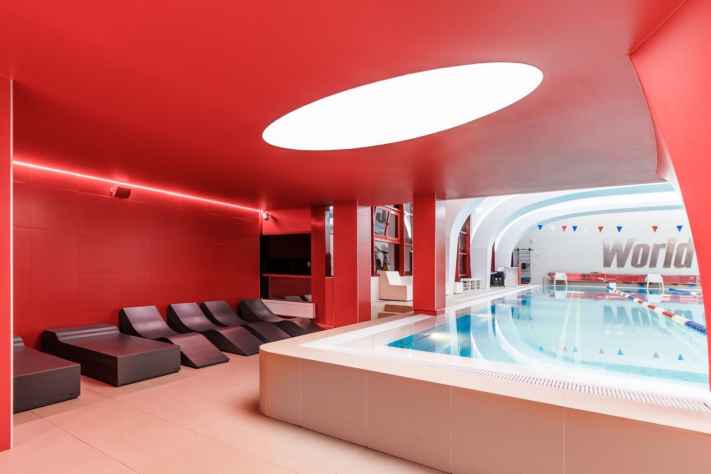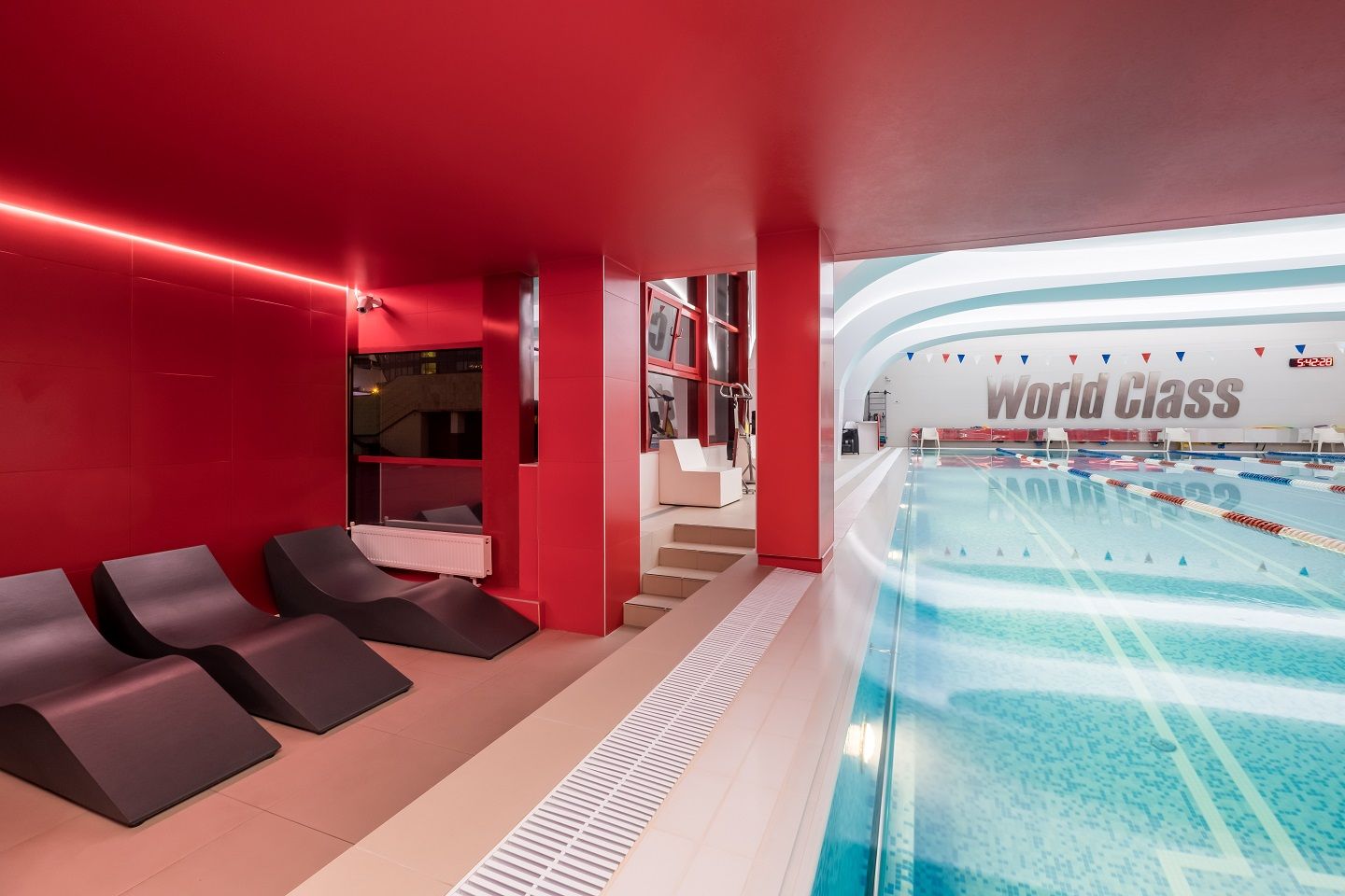 В аква-зоне использованы герметичные светодиодные ленты, которые создают контурную подсветку и подчеркивают форму бассейна. Для разноцветной подсветки ступеней, лестниц, бортиков и других элементов также выбраны герметичные светодиодные ленты, устойчивые к воздействию воды и хлора. Целью проекта освещения было создание уникальной атмосферы и запоминающегося облика фитнес-клуба премиум-класса.