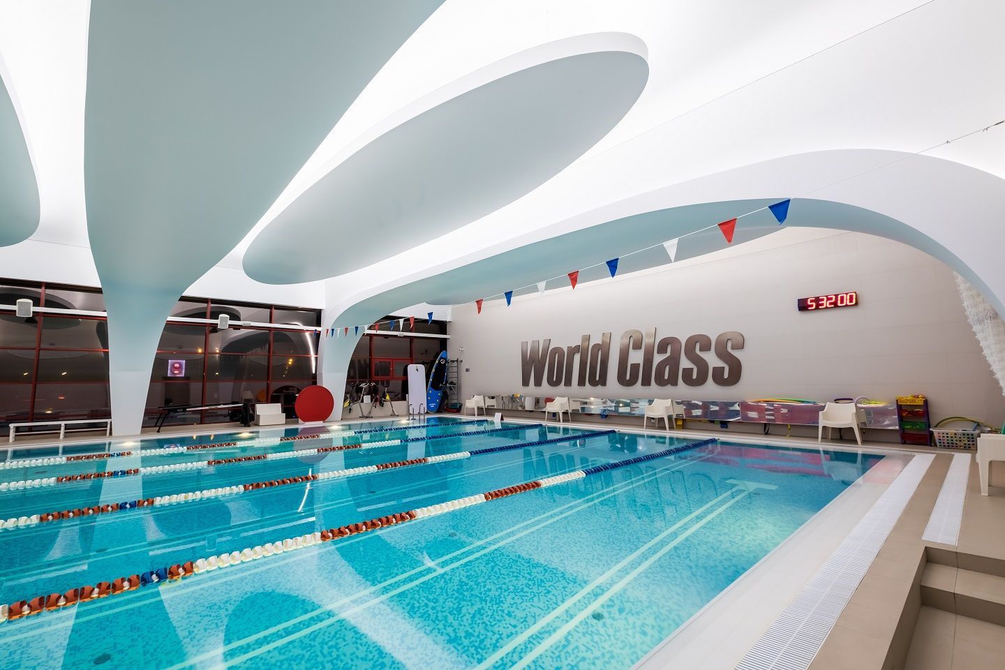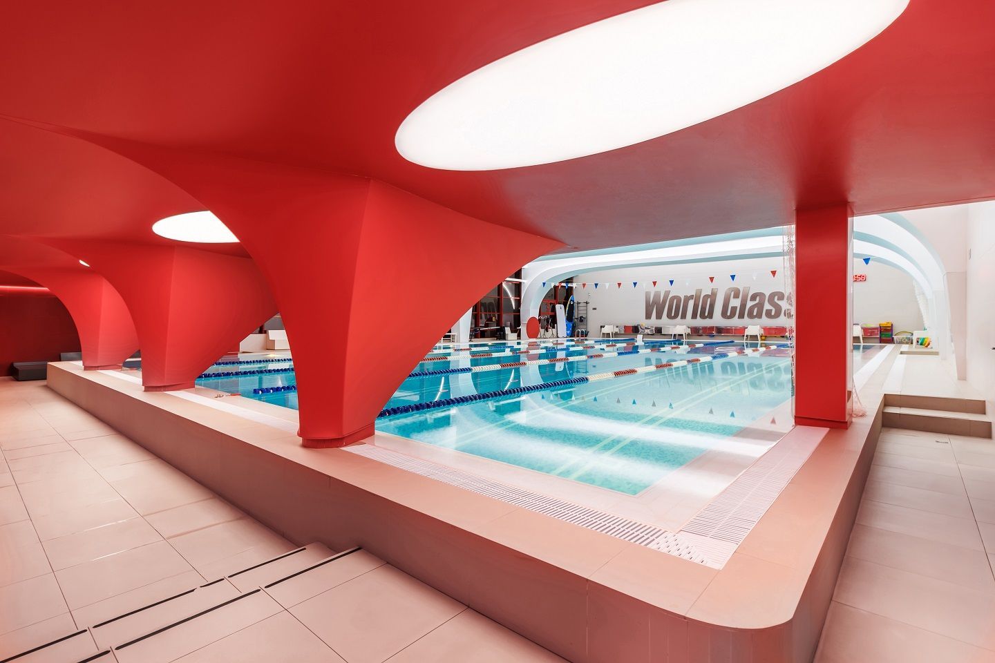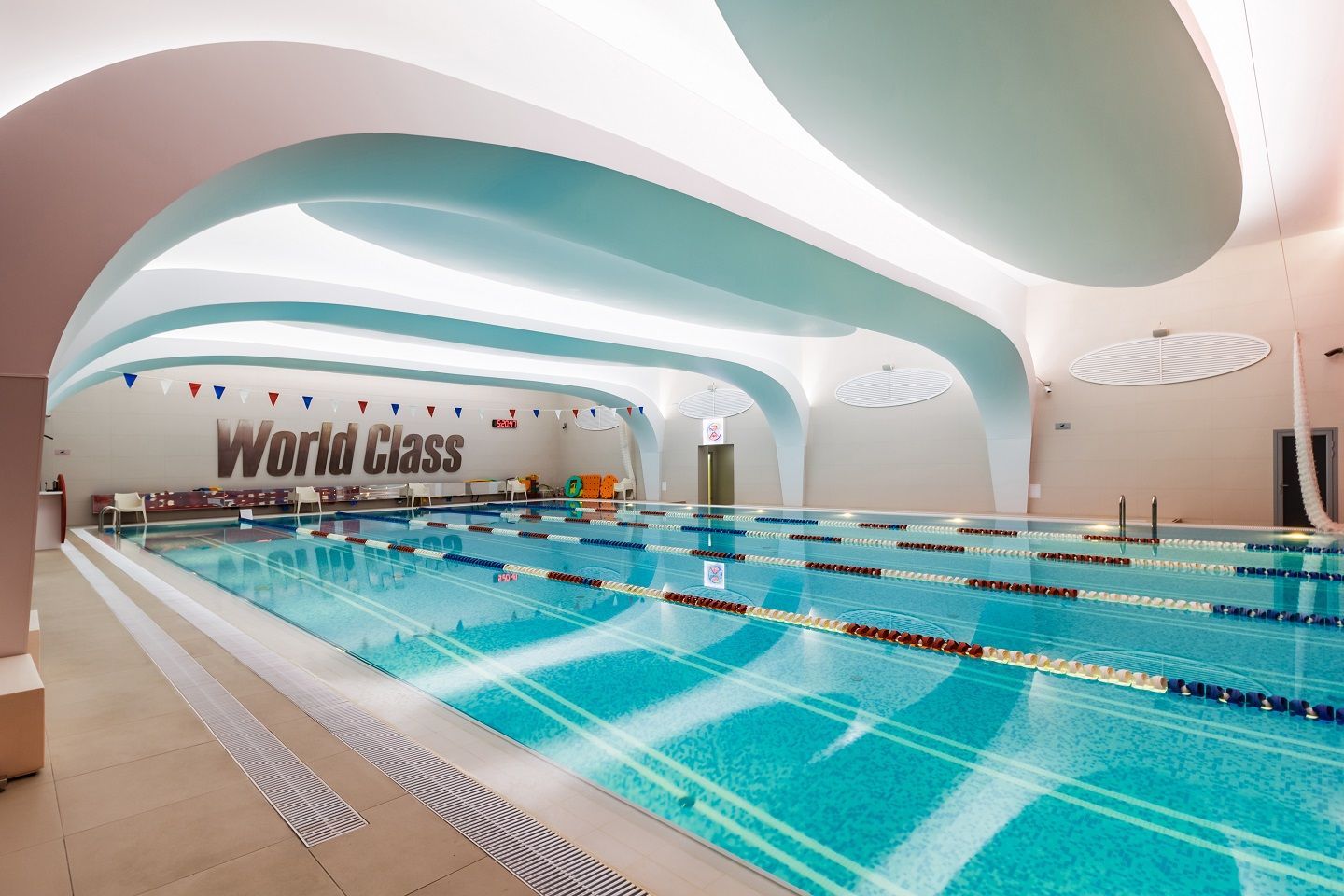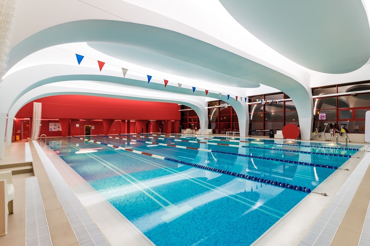 В аква-зоне использованы герметичные светодиодные ленты, которые создают контурную подсветку и подчеркивают форму бассейна. Для разноцветной подсветки ступеней, лестниц, бортиков и других элементов также выбраны герметичные светодиодные ленты, устойчивые к воздействию воды и хлора. Целью проекта освещения было создание уникальной атмосферы и запоминающегося облика фитнес-клуба премиум-класса.