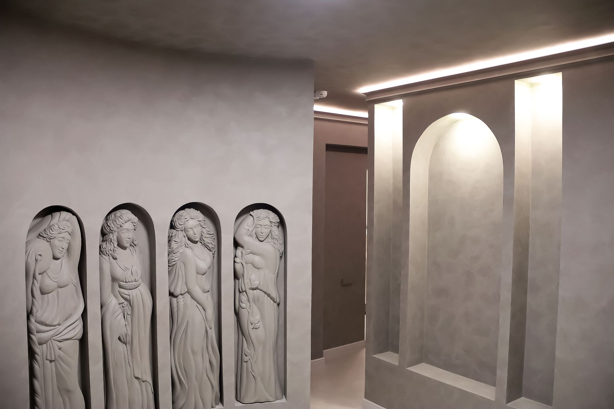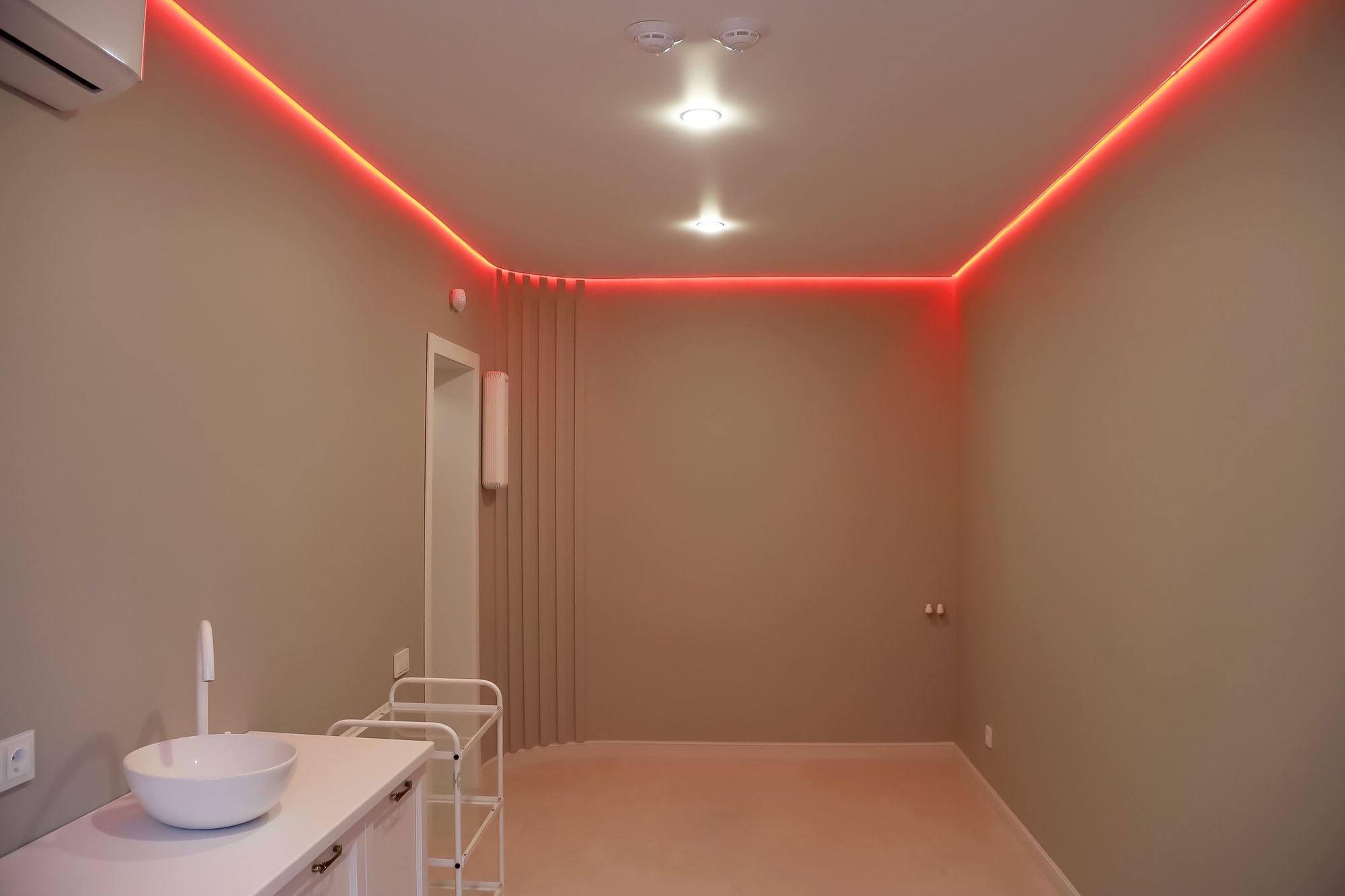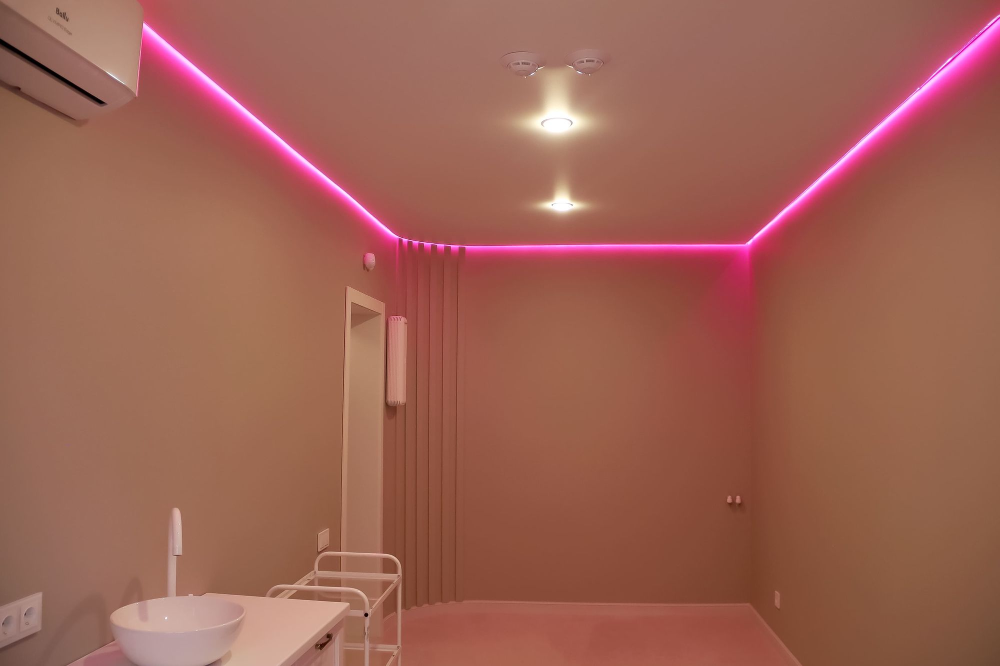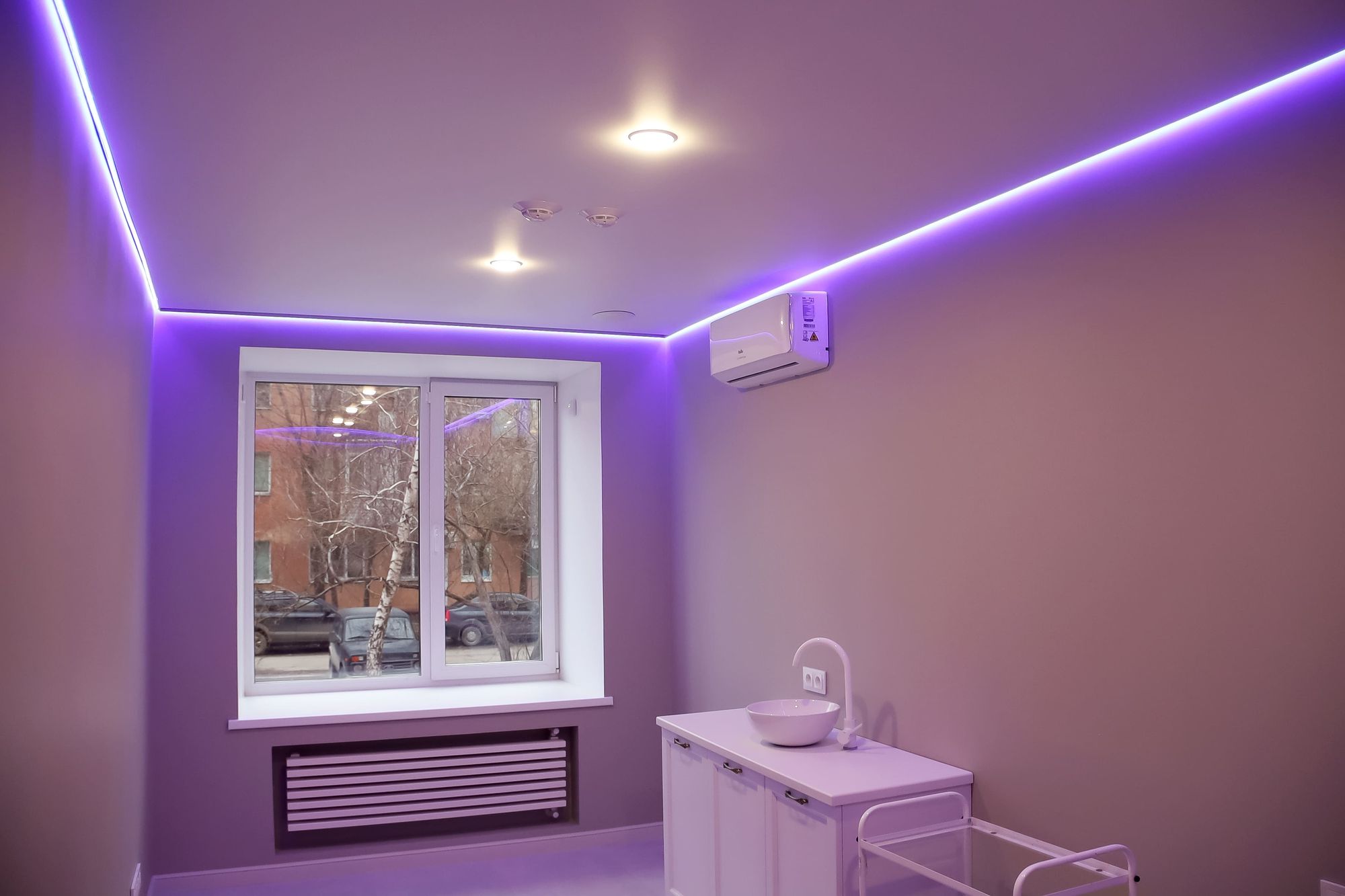 Свет в интерьере клиники соответствует общей концепции дизайна. В отделке использованы холодные оттенки белого и серого, которые подчеркиваются нейтральным дневным светом (4000 К).