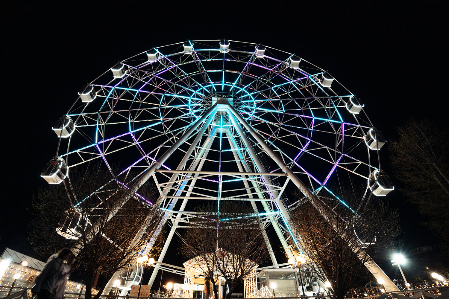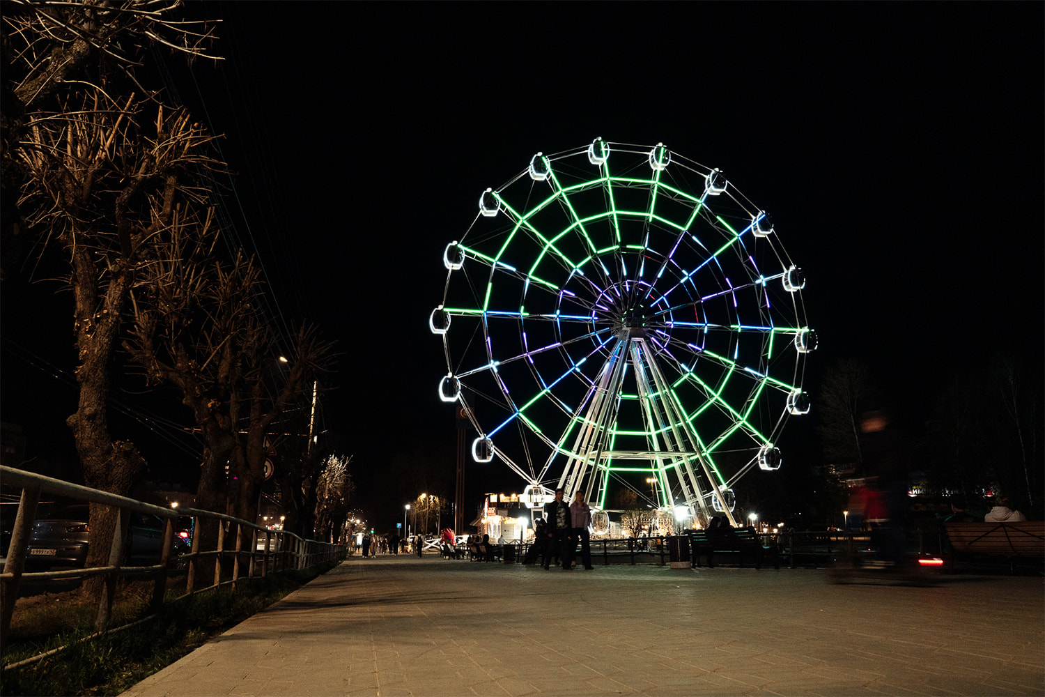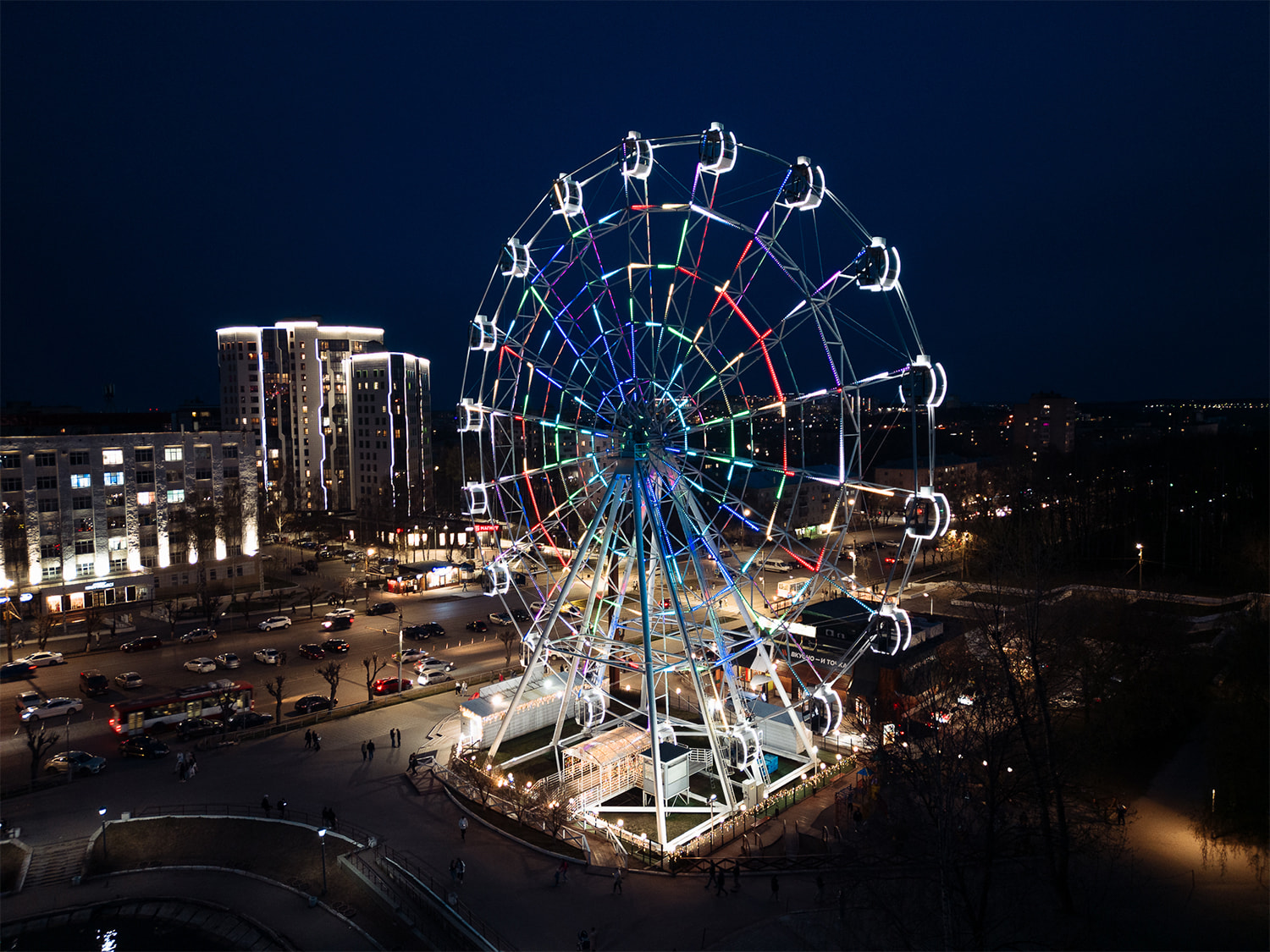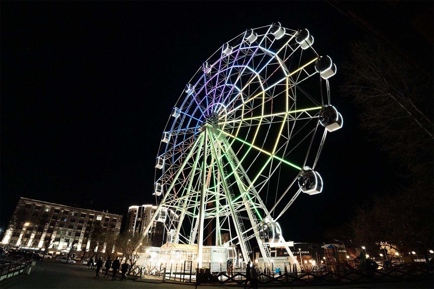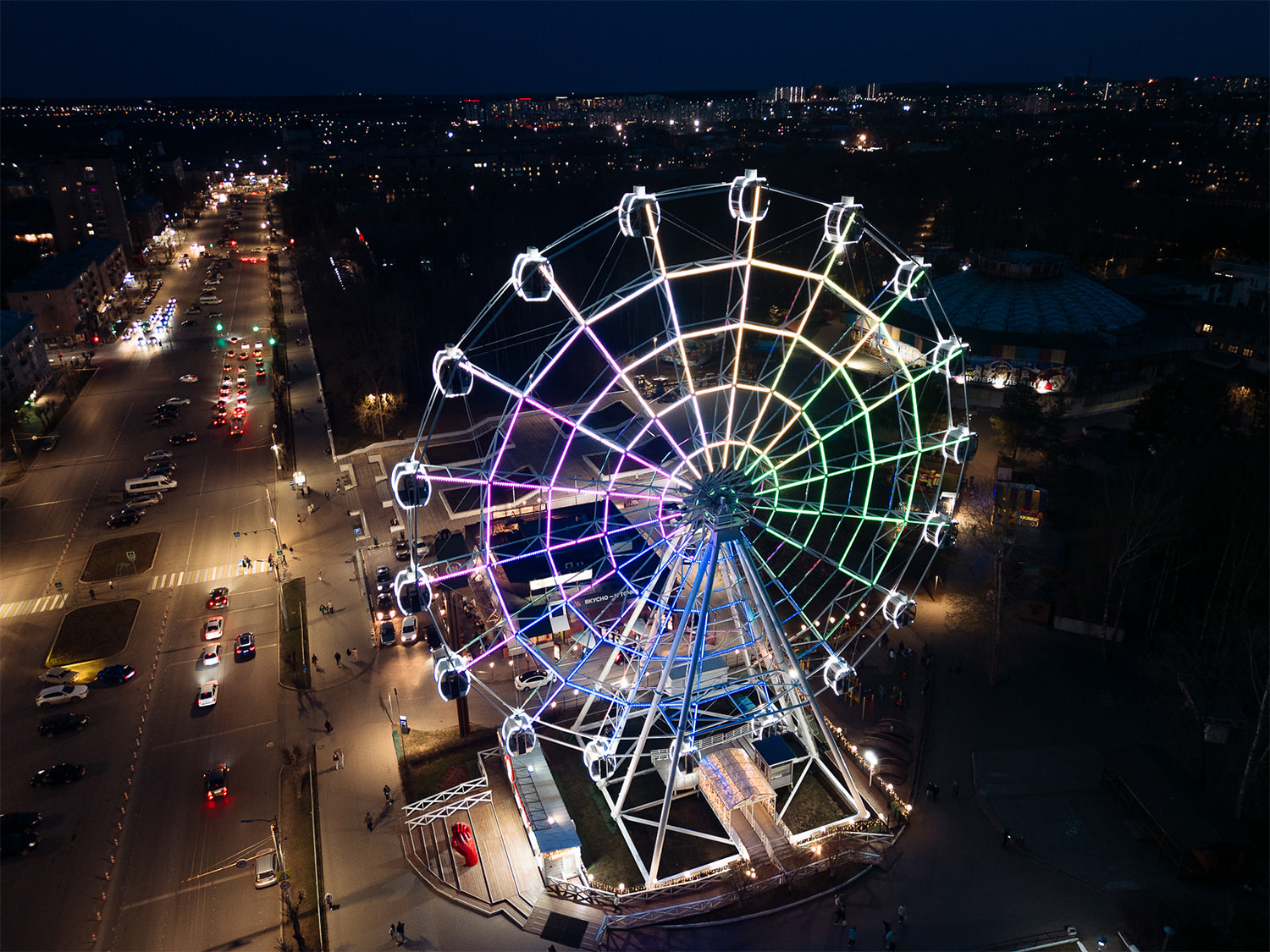 С наступлением сумерек колесо обозрения заливается разноцветной подсветкой, выполненной на основе 3600 управляемых RGB-модулей. Оригинальные динамические эффекты оживляют аттракцион, каждое мгновение создавая новый облик. Благодаря наивысшей степени пылевлагозащиты (IP68) и широкому диапазону рабочих температур модули выдерживают самые неблагоприятные погодные условия.