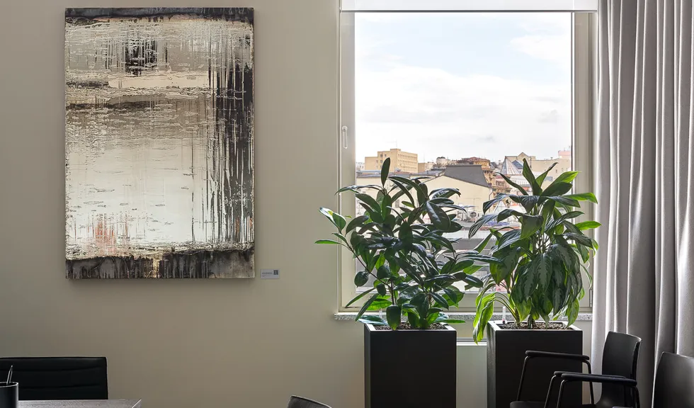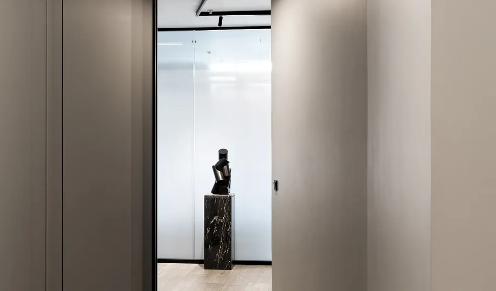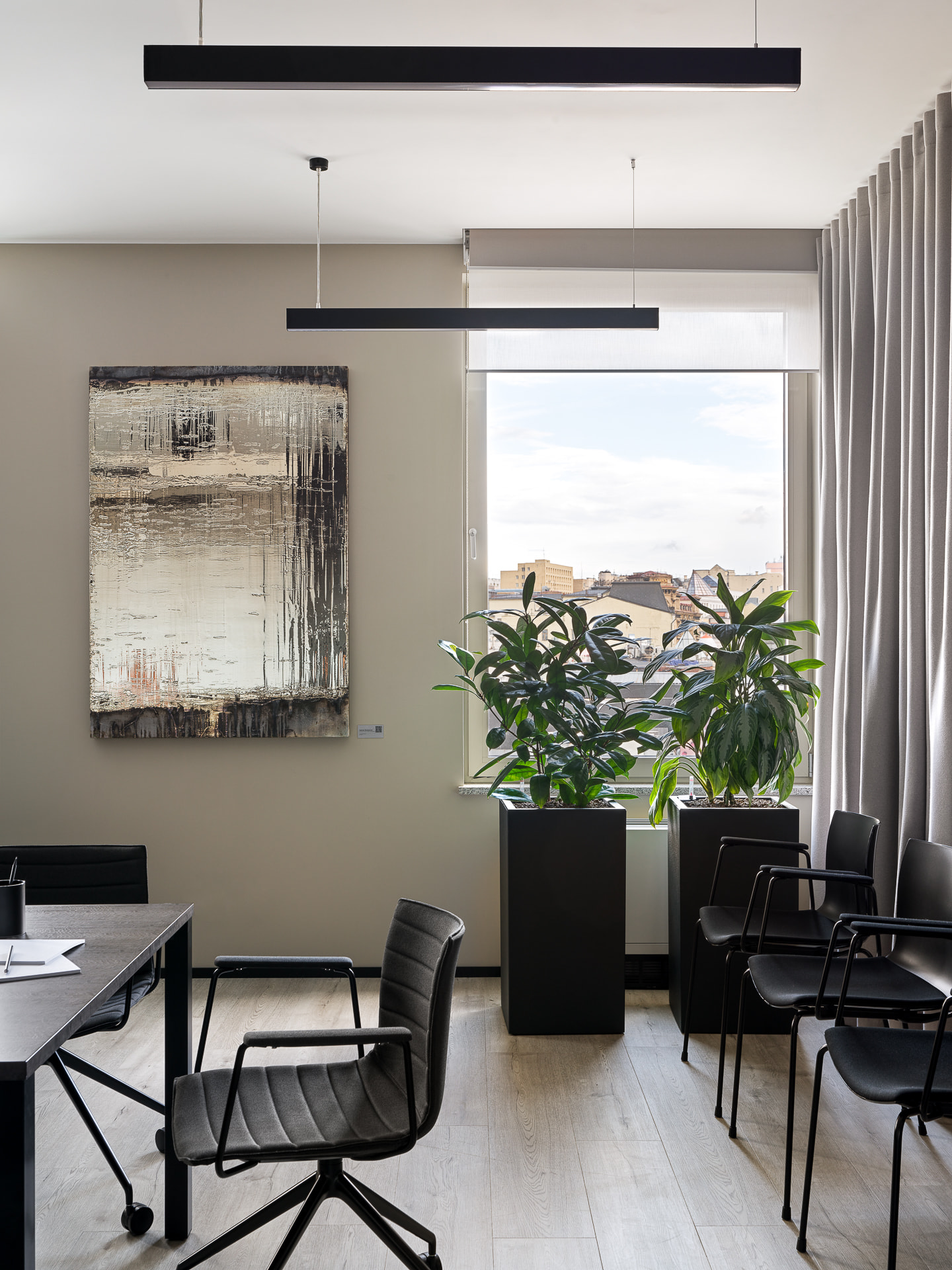 В офисе есть несколько переговорных комнат. Их оборудовали звукоизолирующими шторами. Такое гибкое решение позволяет при необходимости изолировать пространство, надежно ограждая переговоры от фонового шума, что критически важно для работы юридической фирмы.