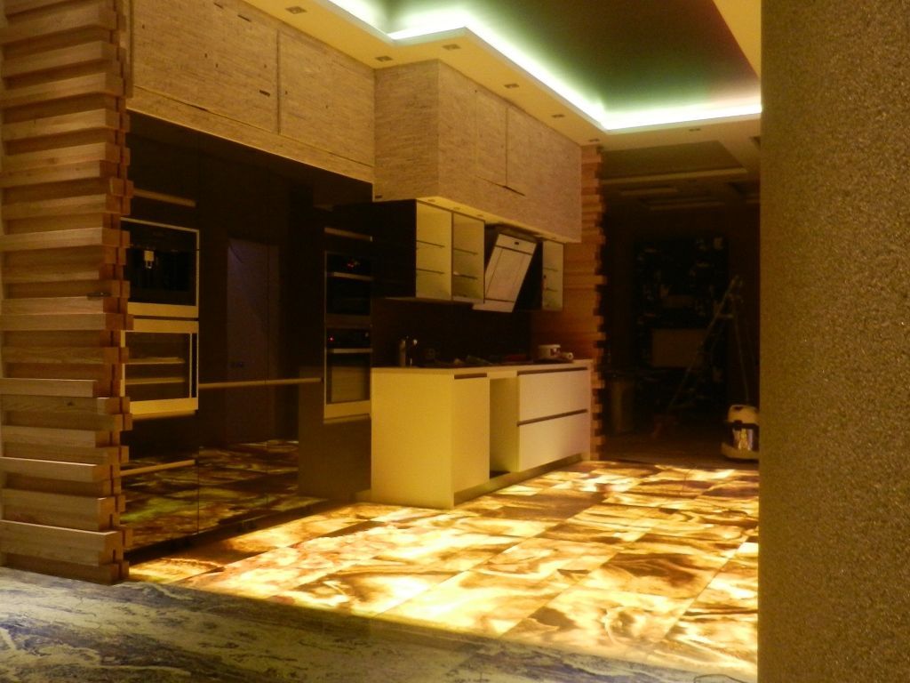 Естественно, что рабочую поверхность подсвечивают светодиодной лентой arlight® белого цвета. Но учтите, что продукты, освещенные дневным белым светом, выглядят максимально натурально, а тёплым белым даже смотрятся свежее и лучше, чем есть. Под холодным белым еда выглядит неаппетитно.