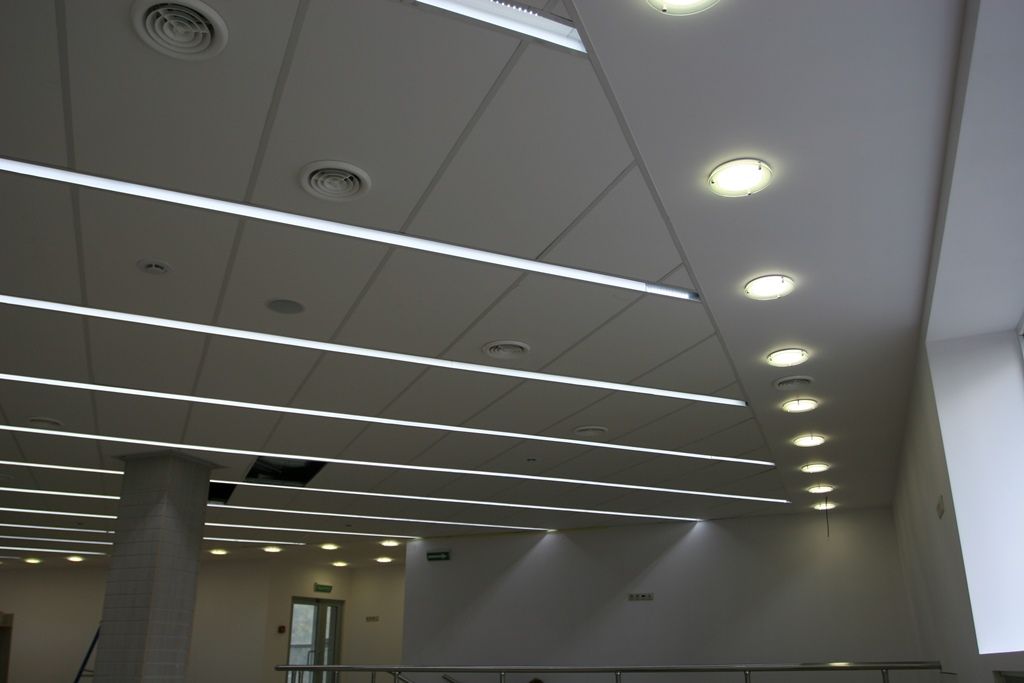 Светодиодное освещение торговых площадей в книжном магазине было выполнено двумя способами. Первый - освещение многоуровневого гипсокартонного потолка, второй - линейные светильники с матовым стеклом, встроенные в потолок Армстронг. Эти светильники создали эффект равномерных световых линий. В обоих вариантах освещения применялось светодиодная продукция торговой марки arlight®.