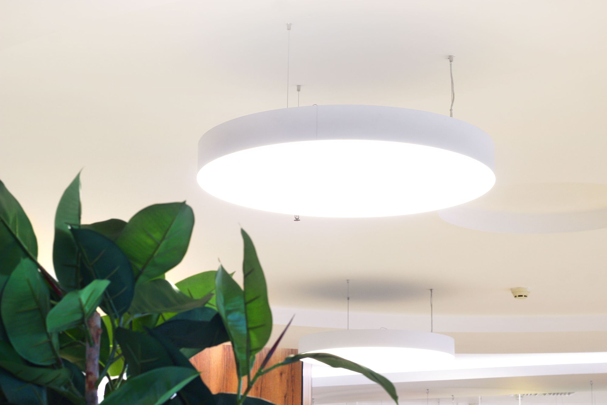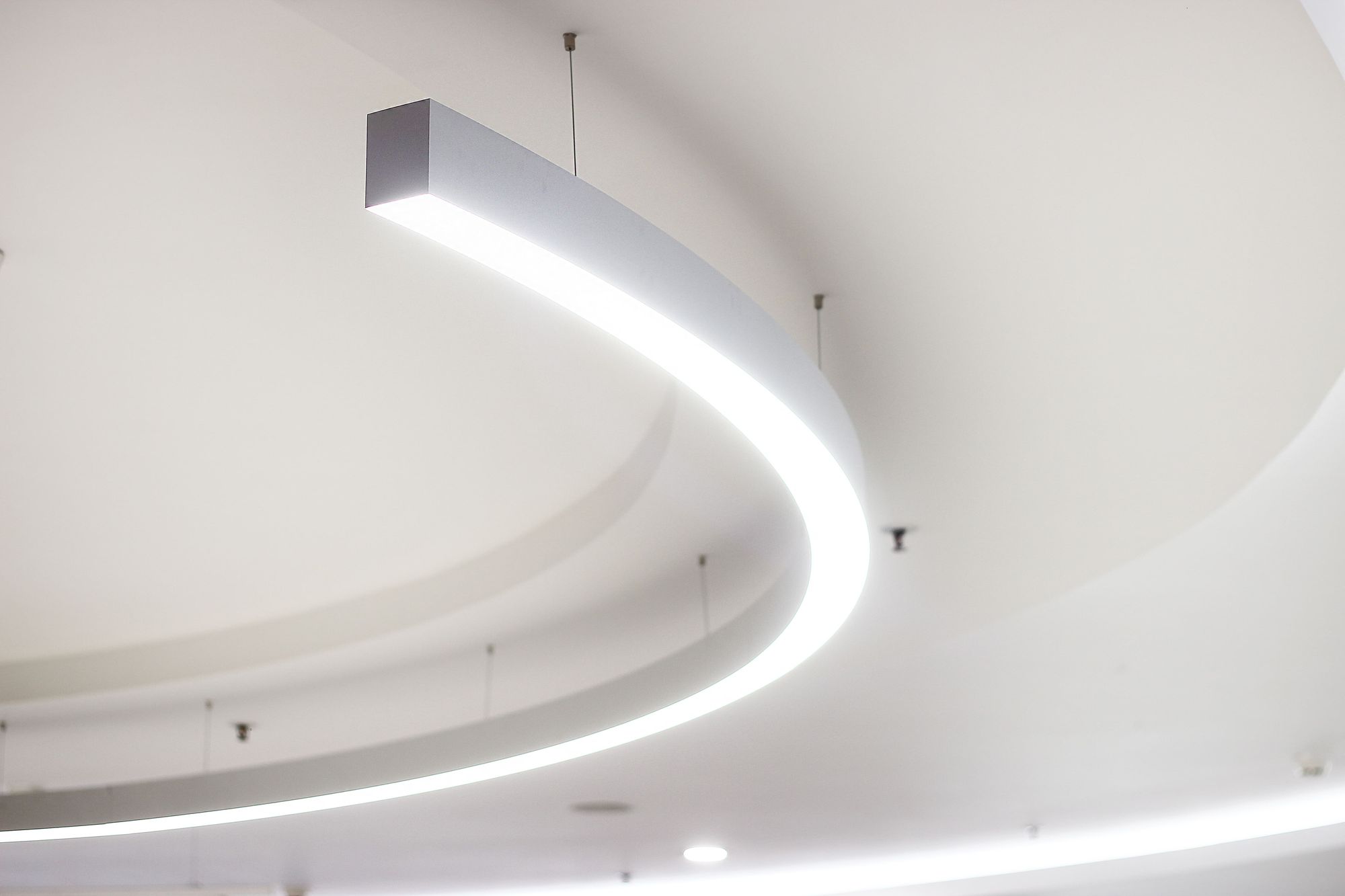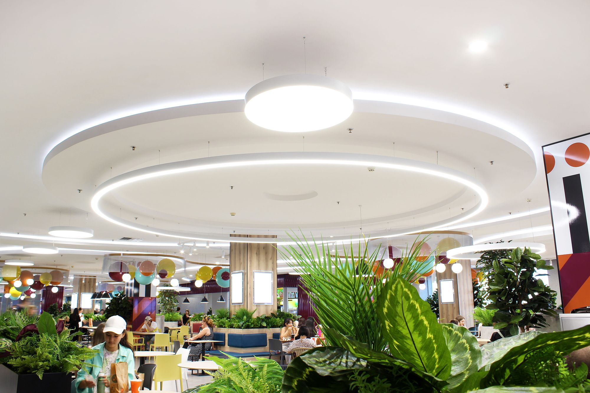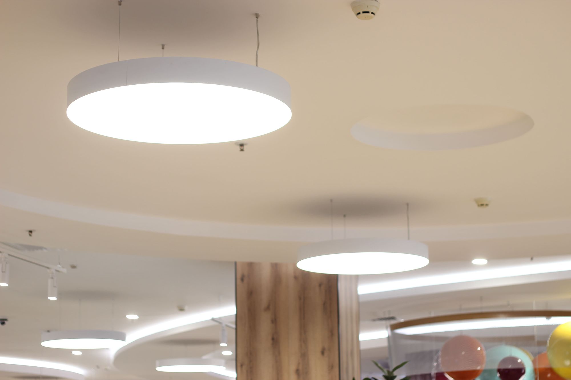 Светильники поддерживают общую тему: в интерьере используются светильники-шары и круглые даунлайты, дуговые профильные светильники, а изгибы округлых ниш и выступов подчеркивает бодрящая белая подсветка на основе светодиодной ленты RT. Лента с превосходным индексом цветопередачи (CRI 95–98) не искажает цветовую гамму предметов и позволяет товарам выглядеть неизменно выигрышно.